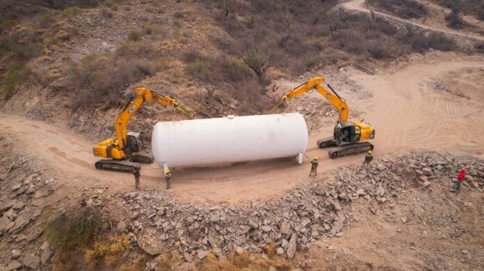 Para llevar a cabo la instalación en una zona complicada, se utilizaron tres retroexcavadoras oruga para elevar el depósito de PRFV sobre una base de hormigón en una zona elevada.