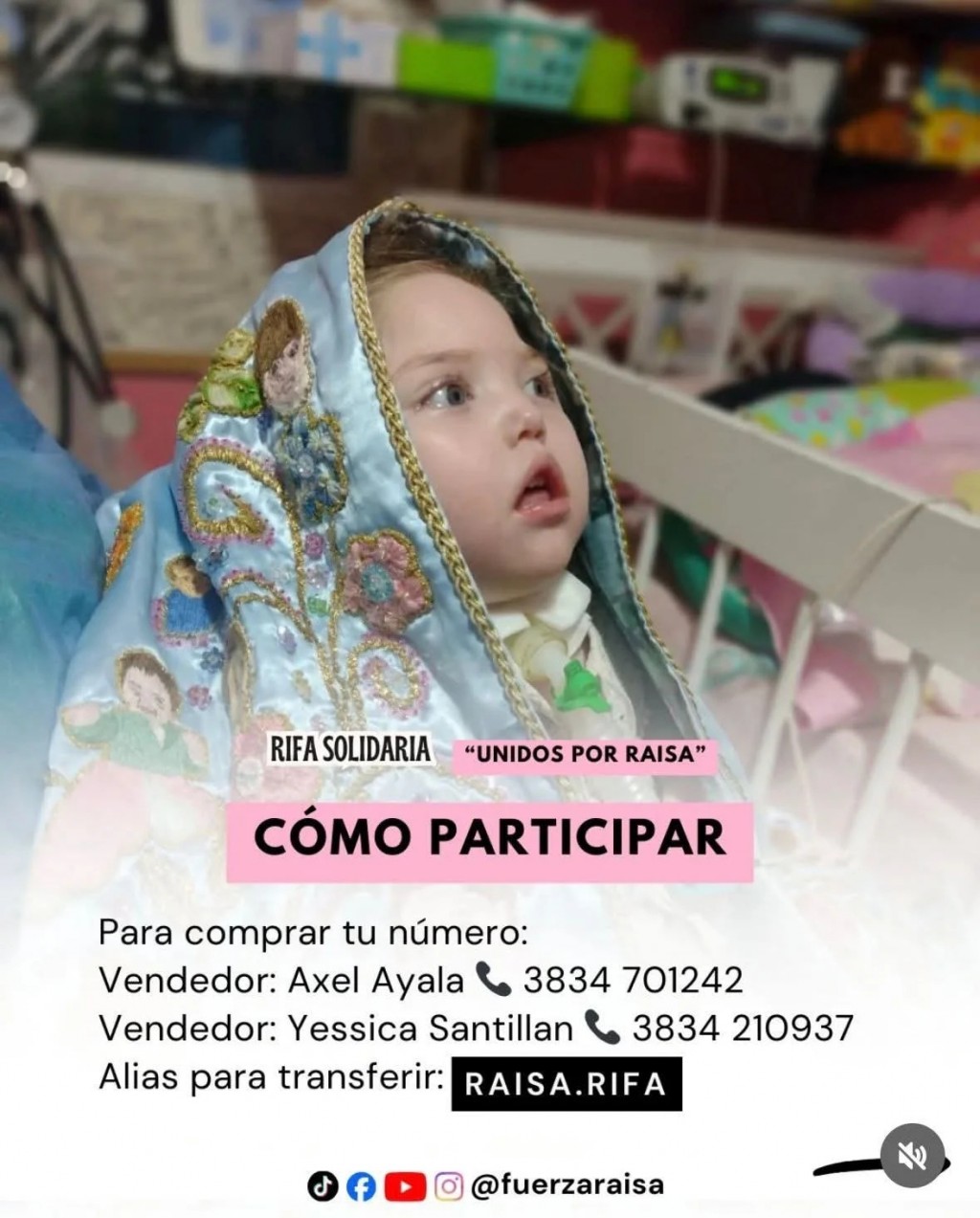 Quienes deseen colaborar pueden hacerlo adquiriendo su número a través de transferencia bancaria, utilizando el alias RAISA.RIFA, habilitado a nombre de la madre de la niña. Una vez realizado el aporte, la familia confirma el número correspondiente a cada participante.